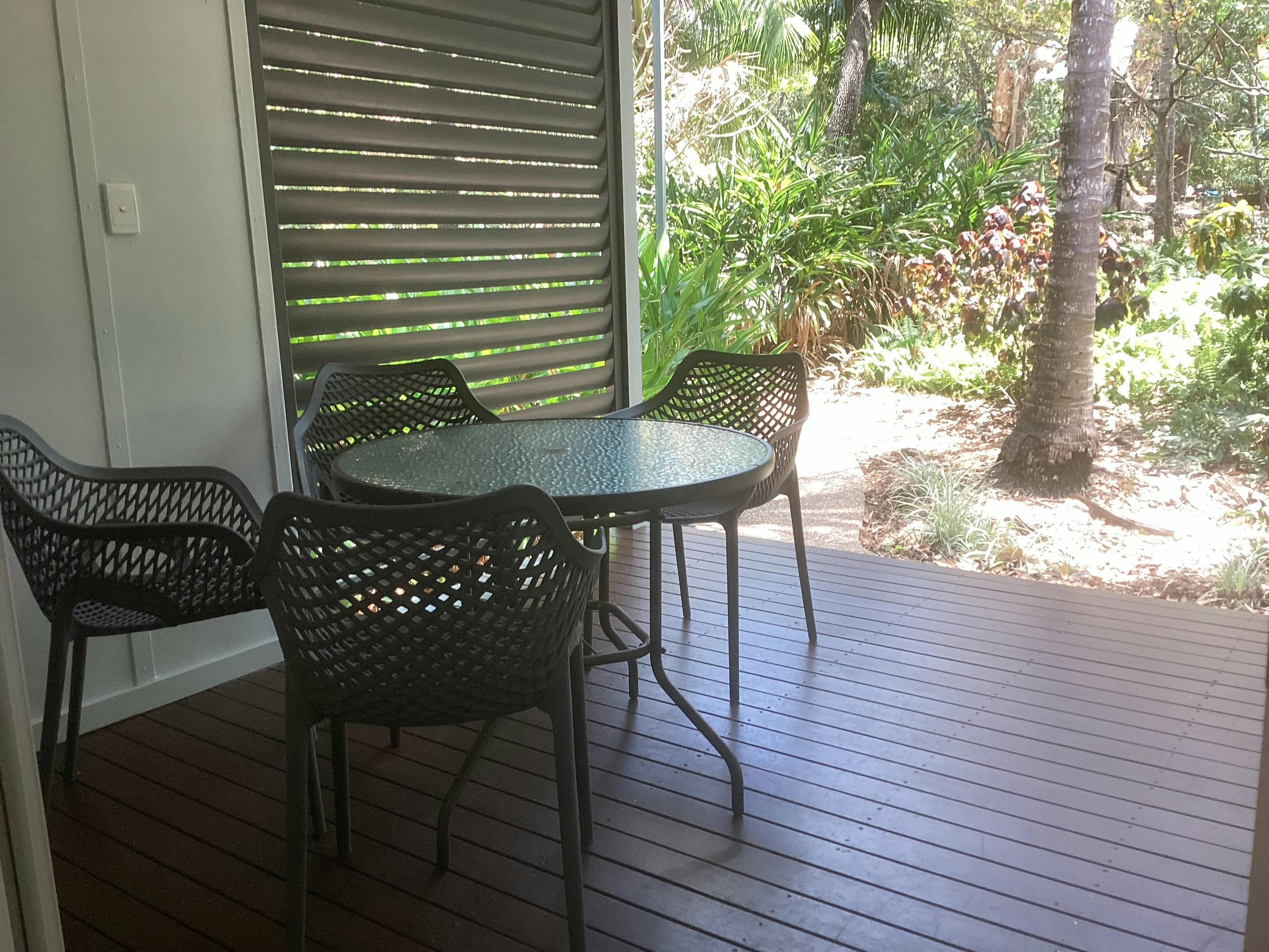 This chalet has a queen bed and a double sofa bed, a kitchen with a full size fridge, own private ensuite, dining table, air-con and fans, television and a small balcony. Self contained
